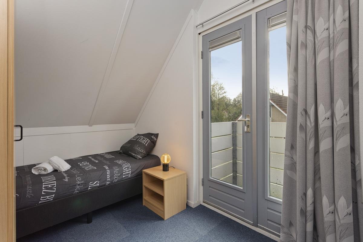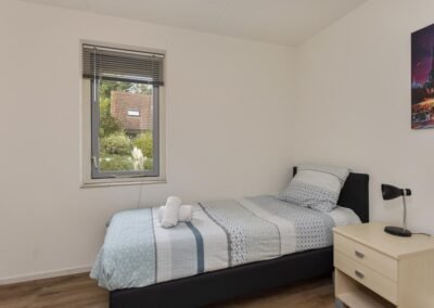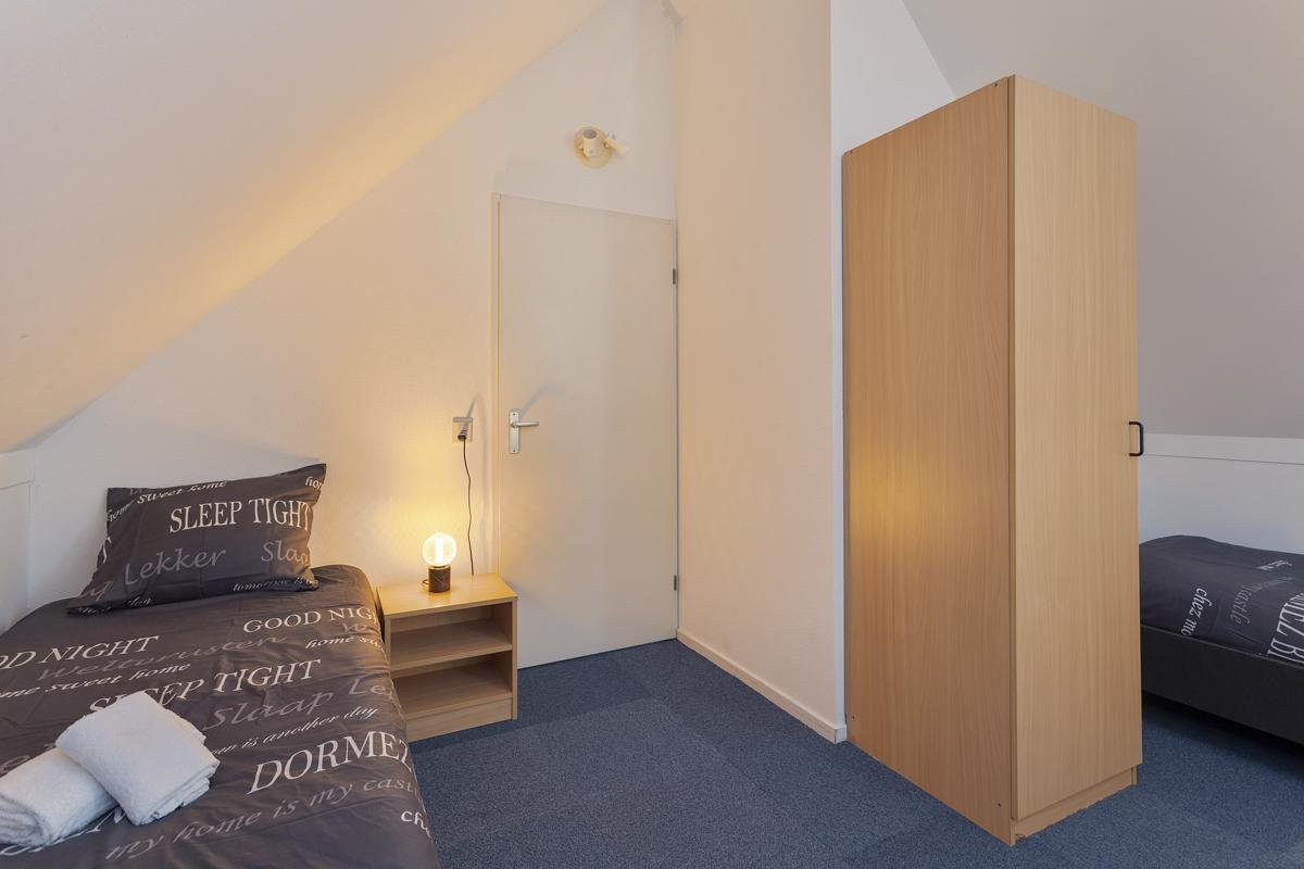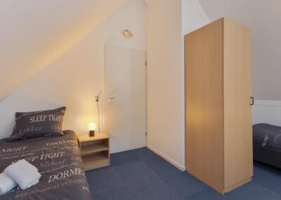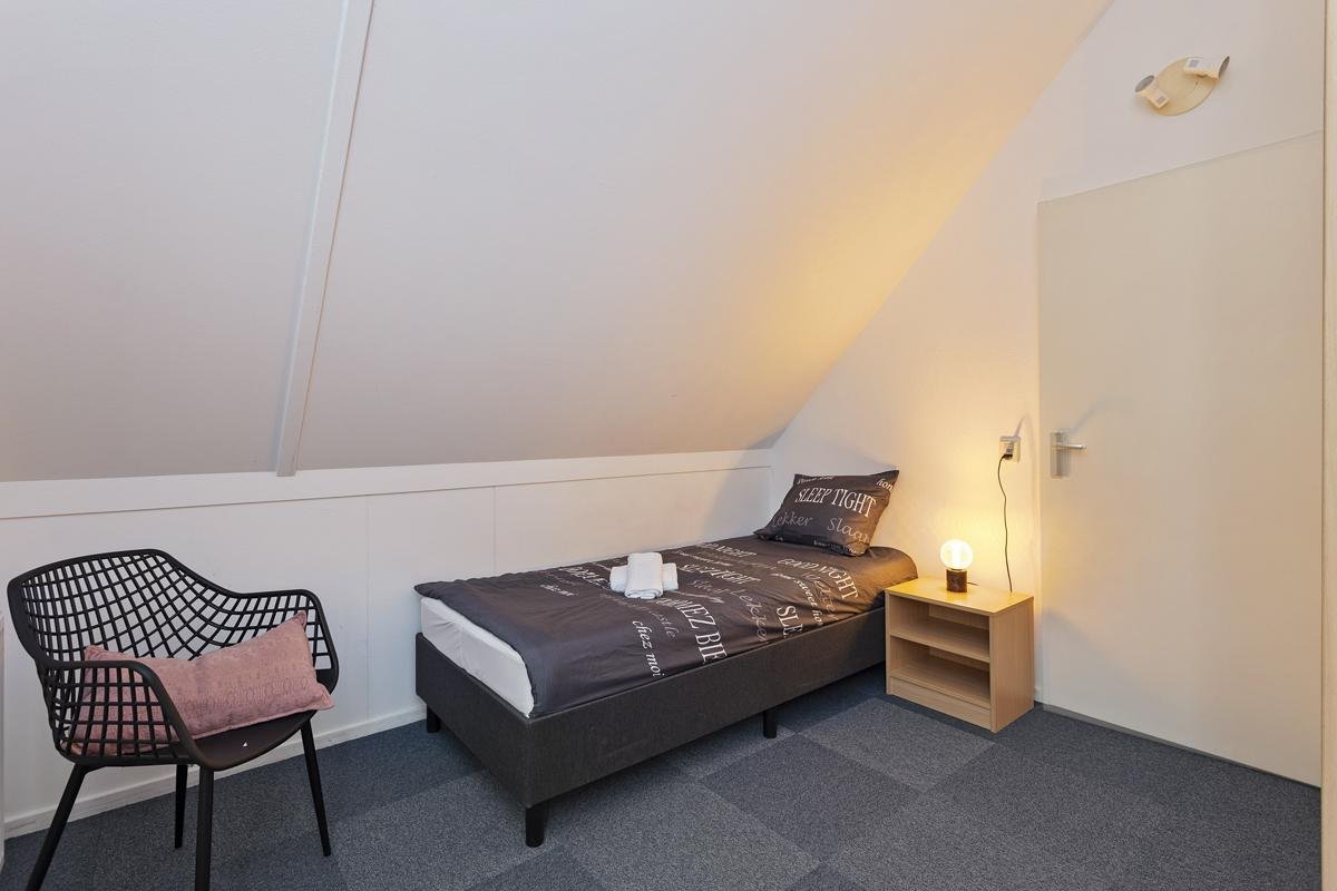 Op de begane grond naast de woonkamer is een slaapkamer die voorzien is van een éénpersoonsbed met kussen en dekbed en een leghangkast.