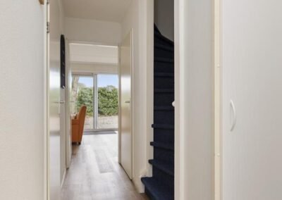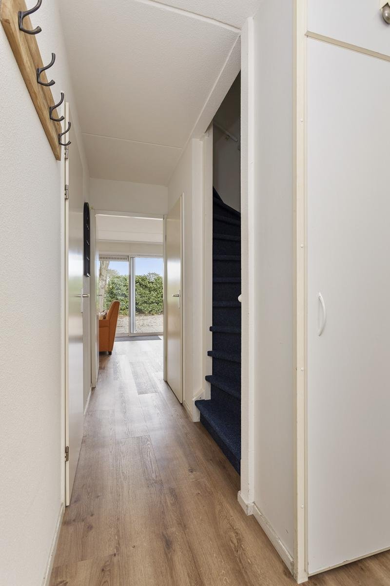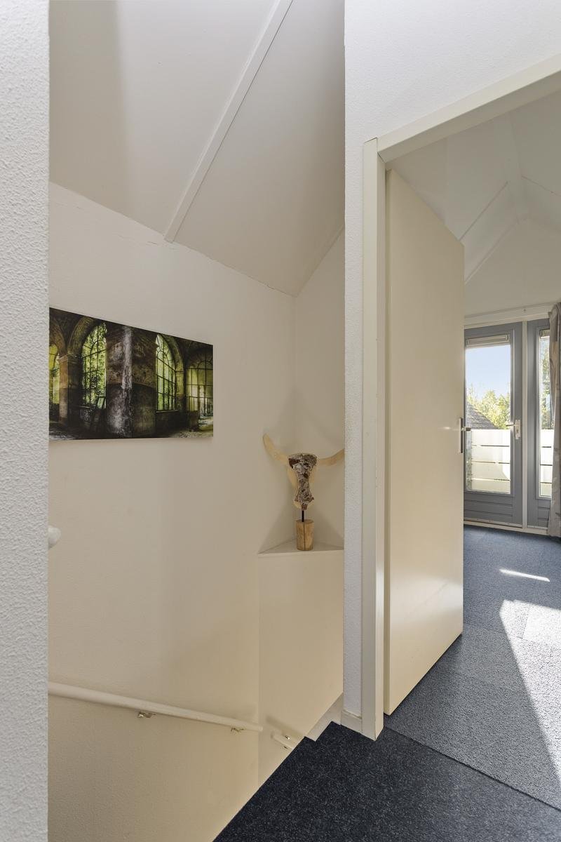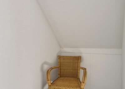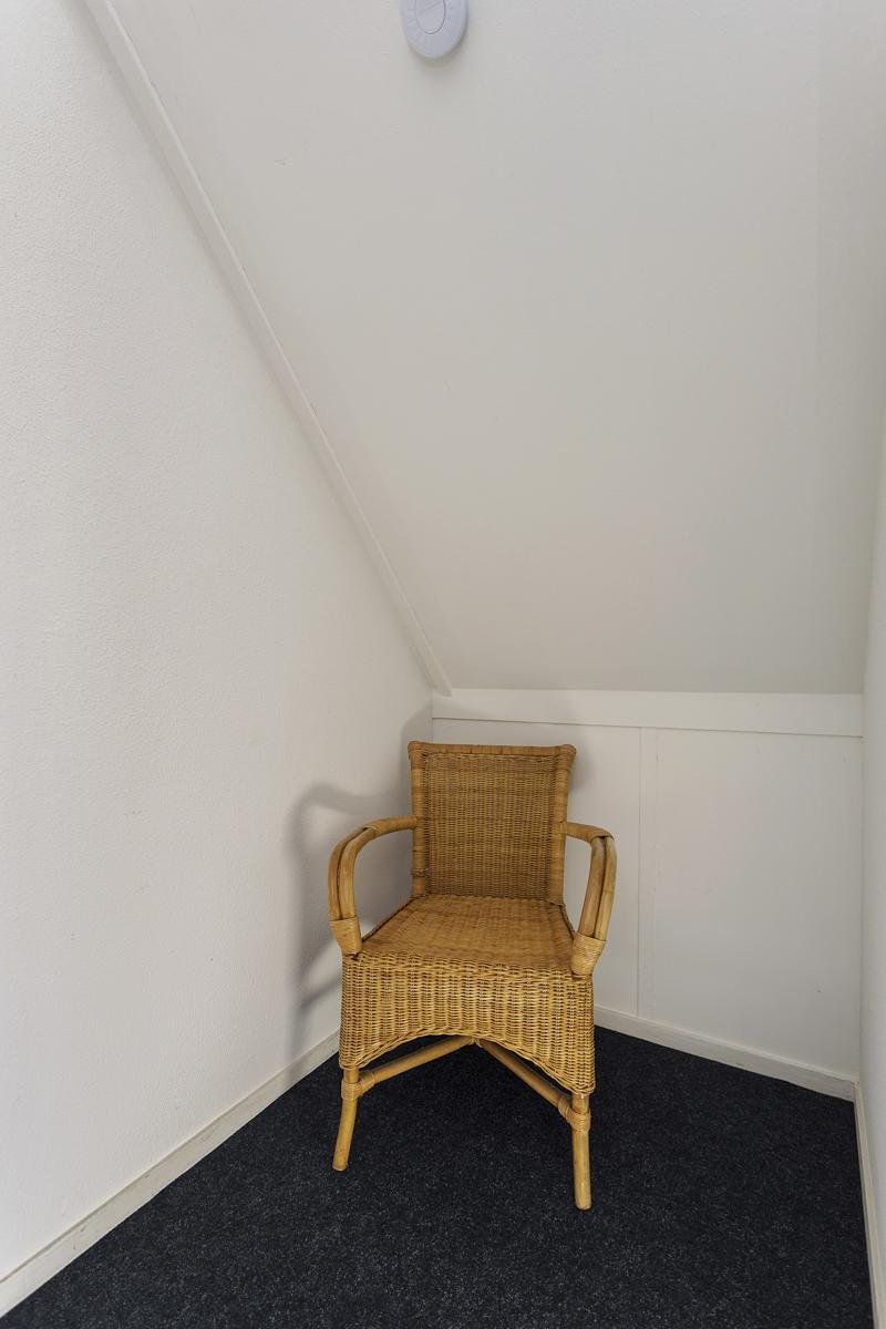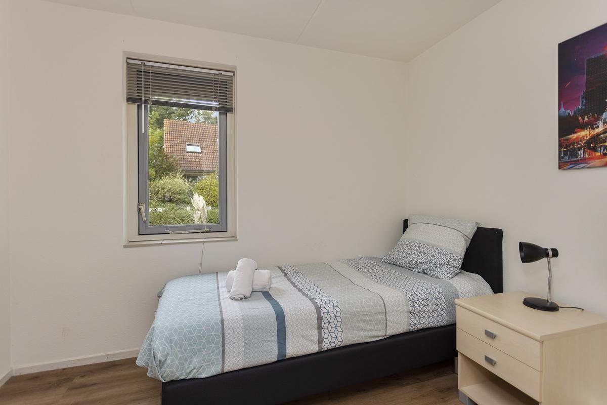 Op de begane grond naast de woonkamer is een slaapkamer die voorzien is van een éénpersoonsbed met kussen en dekbed en een leghangkast.
