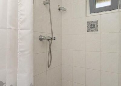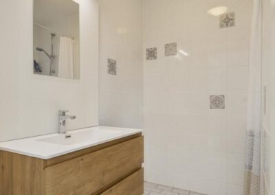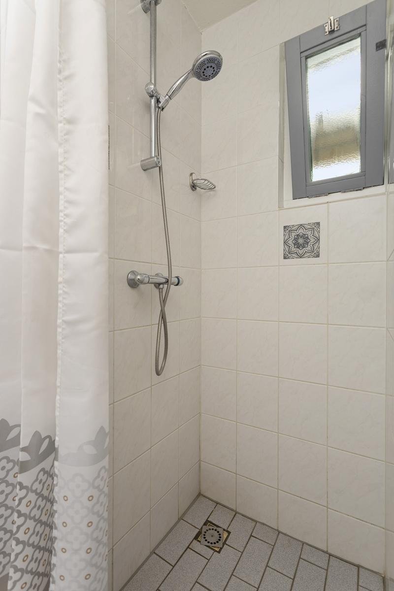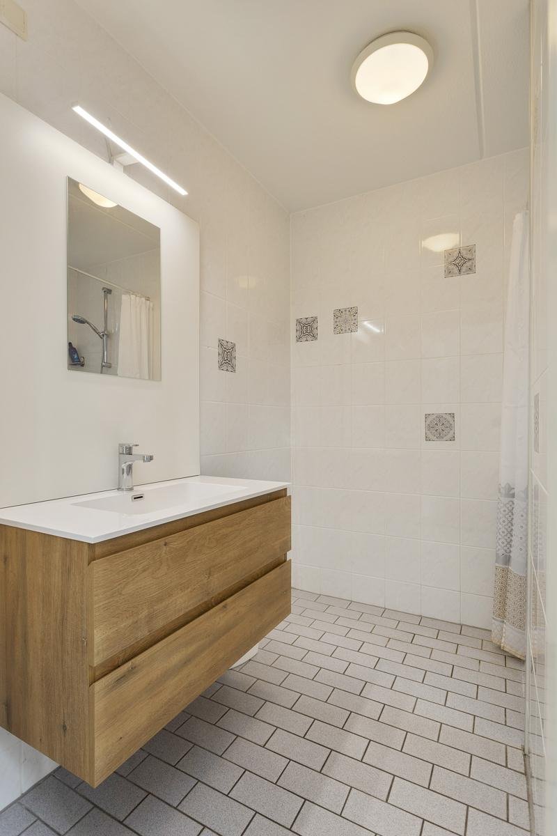 De badkamer bestaat uit een douche, een wastafel met spiegel en een badkamermeubelkast. Haarföhn is aanwezig. De ruimte wordt verwarmd met vloerverwarming.