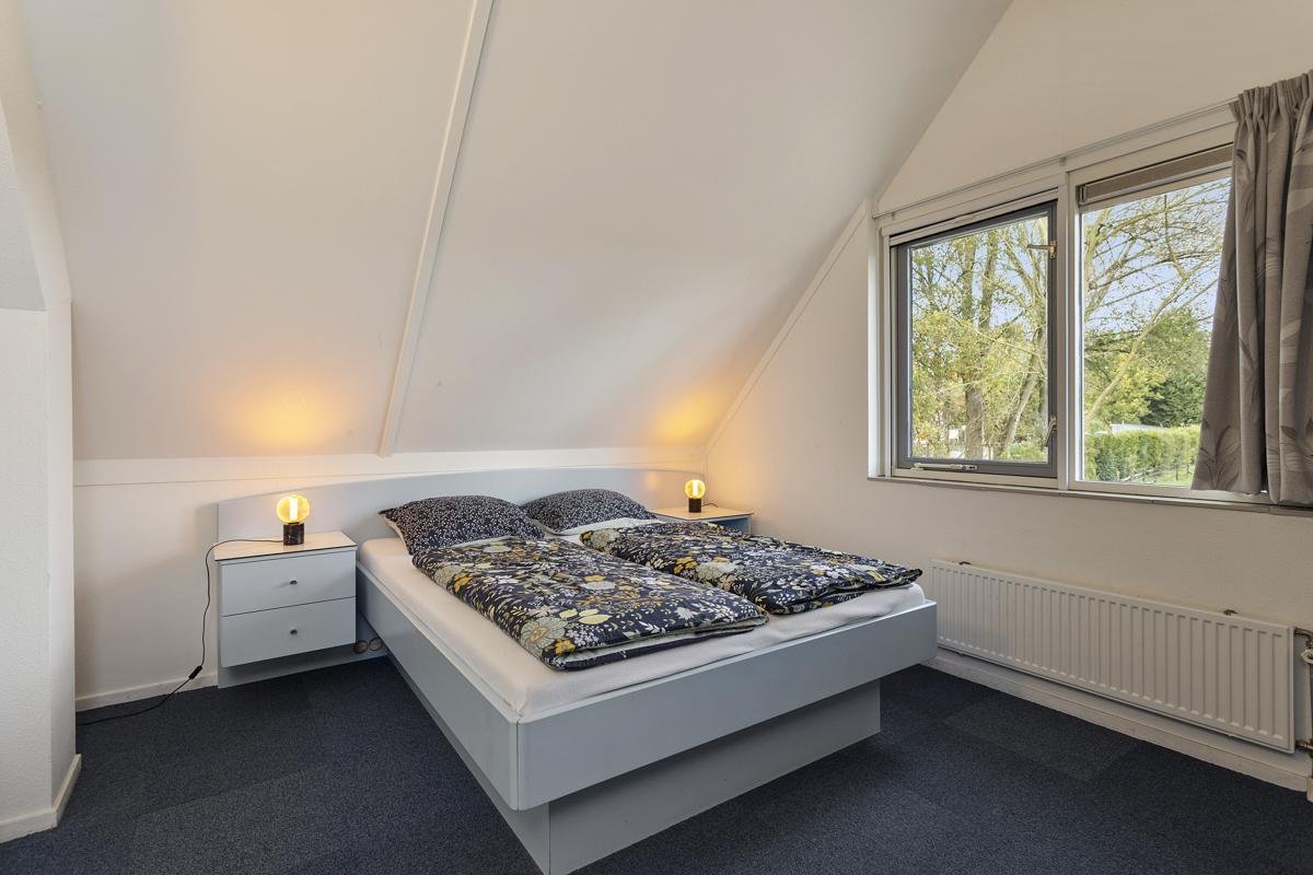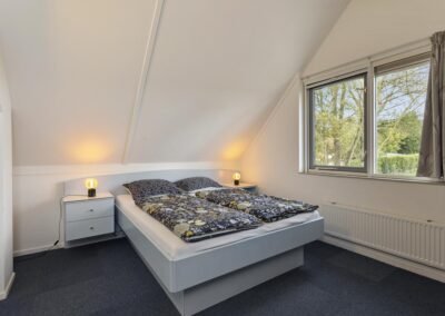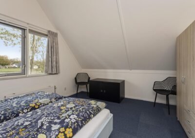 Deze slaapkamer bevindt zich op de 1e etage. Naast een kledingkast staat in deze kamer een tweepersoonsbed met twee losse matrassen. Totale breedte van het bed is 1,6 meter breed. Op het bed zijn twee kussens en twee éénpersoonsdekbedden. Deze slaapkamer is voorzien van een horgordijn.