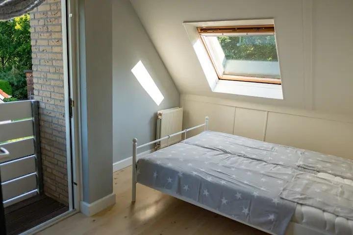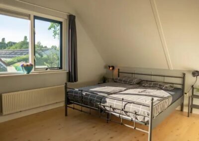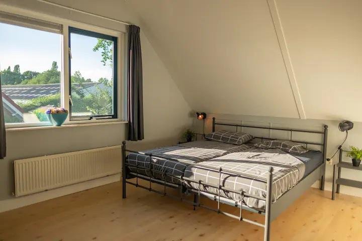 Op de bovenverdieping bevindt zich een slaapkamer met een tweepersoonsbed van 1,6 meter breed met 2 aparte matrassen, 2 kussens en 2 éénpersoonsdekbedden.