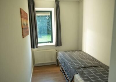 Op de begane grond naast de woonkamer is een slaapkamer met een eenpersoonsbed met kussen en dekbed.
