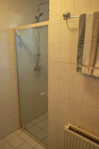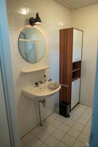 De badkamer bestaat uit een douche en een wastafel met spiegel en een badkamermeubelkast. De ruimte wordt verwarmd met een standaard radiator.