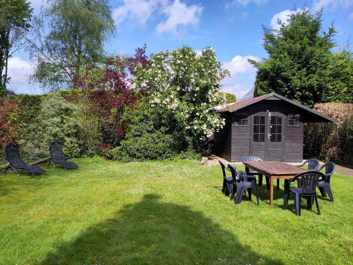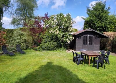 De tuin bestaat uit gras omringd met bomen en struiken. Er is veel privacy. Met de aanwezig tuinmeubels kunt u heerlijk in de tuin zitten. Vanuit de schuifpui van de woning betreedt u een terras waar een houten tafel zet staat.